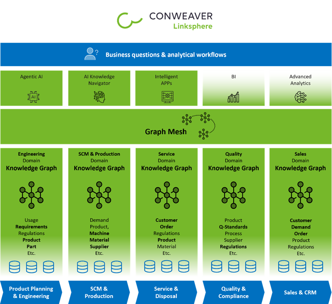 Über mehr als zwei Jahrzehnte entwickelten sich Knowledge Graphen (KGs) von manuell kuratierten Strukturen zu großflächigen, maschinell verknüpften semantischen Backbones. Mit wachsendem Datenvolumen, steigender Modellkomplexität und organisatorischer Skalierung haben sich die primären Herausforderungen verschoben: von der technischen Machbarkeit hin zu nachhaltiger Modellierung, Eigenverantwortung und Governance. Wir beschreiben die Perspektive von CONWEAVER auf Graph Mesh und Domänen-Knowledge-Graphen: als eine architektonische und organisatorische Lösung, um skalierbare, hochperformante und businessorientierte Enterprise Knowledge Graphen zu ermöglichen.